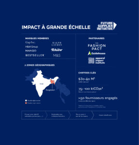 Parallèlement, nous déployons à plus grande échelle la Future Supplier Initiative (FSI). Lancée en 2024 en collaboration avec l’Apparel Impact Institute et Guidehouse, la FSI poursuit son développement afin de favoriser une décarbonation profonde du secteur de la mode grâce à des mécanismes de financement collectif. Sa mission : aider les marques et les fournisseurs à atteindre leurs SBT en développant et en finançant des projets qui diminuent la pression financière exercée sur les fournisseurs ; les marques participantes jouant un rôle important dans la limitation des risques liés aux prêts et dans l’accompagnement de cette transition. Actuellement présents au Bangladesh et en Inde avec sept marques partenaires, nous visons à élargir notre périmètre d’action en nous déployant dans d’autres zones géographiques, notamment au Vietnam et en Chine, pour intégrer davantage de marques et mettre en place un modèle adapté aux PME.