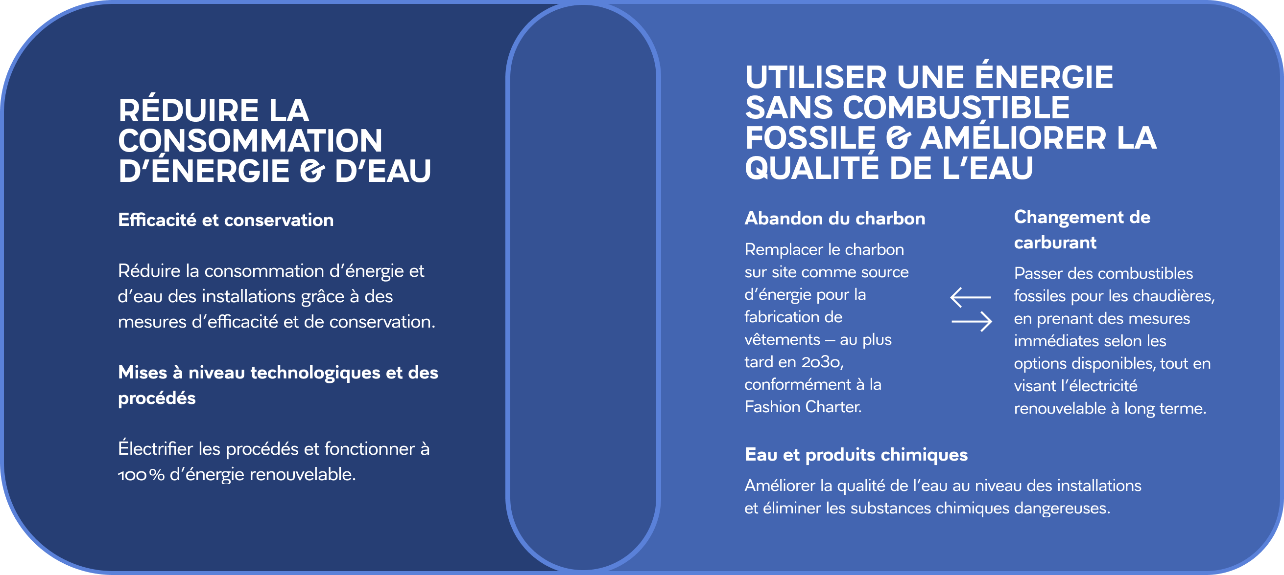 Accroître l’efficacité énergétique et l’usage d’énergies sans fossile, réduire la consommation d’eau douce, améliorer la qualité de l’eau et garantir l’absence de rejets de substances chimiques dangereuses dans les chaînes d’approvisionnement de niveaux 1 à 3 afin de réduire les émissions absolues de gaz à effet de serre.
